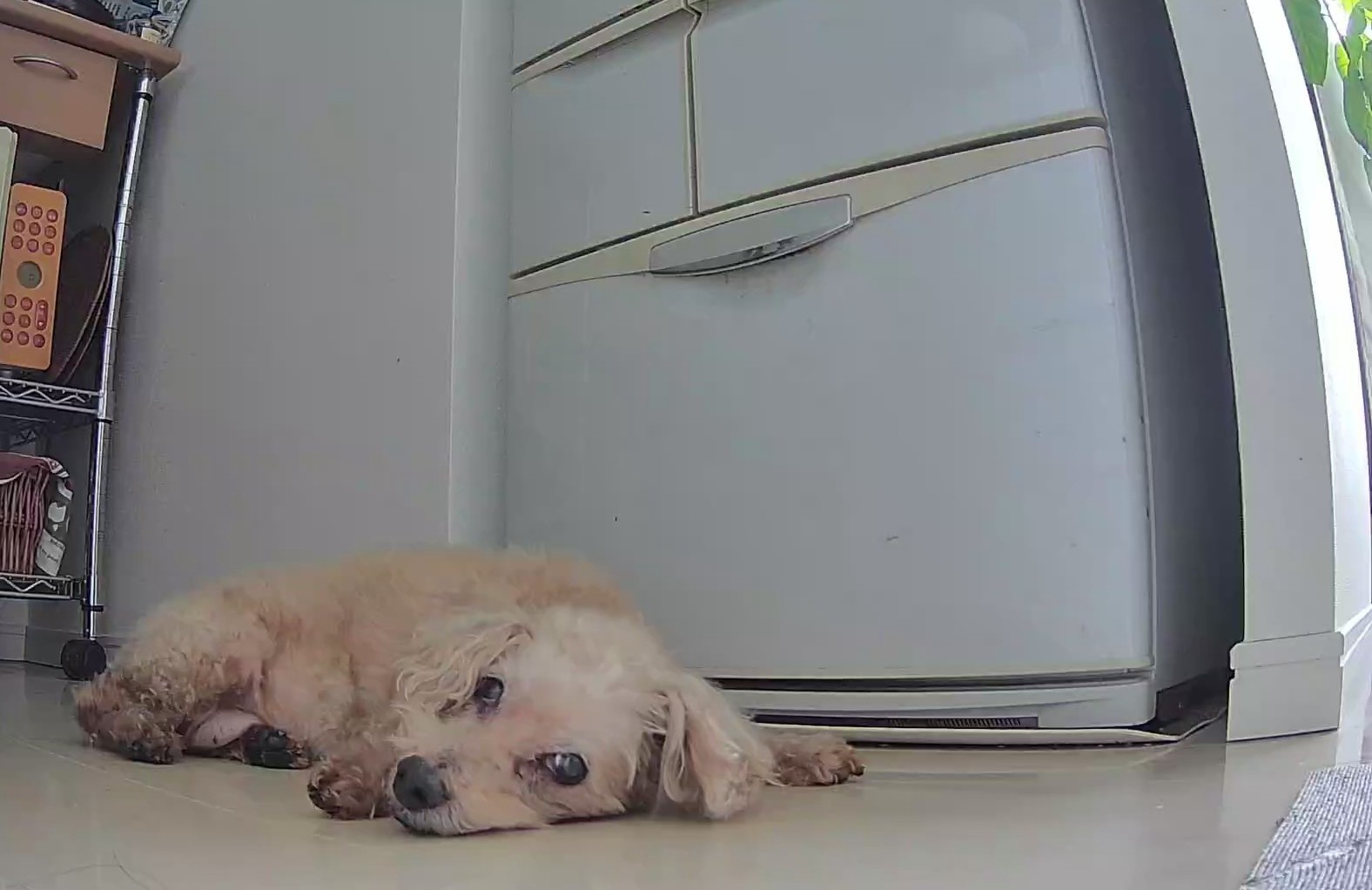 数年前からペットカメラでお留守番中の様子を確認しているのですが、最近は冷蔵庫の前に寝そべっているのがお気に入りです☆