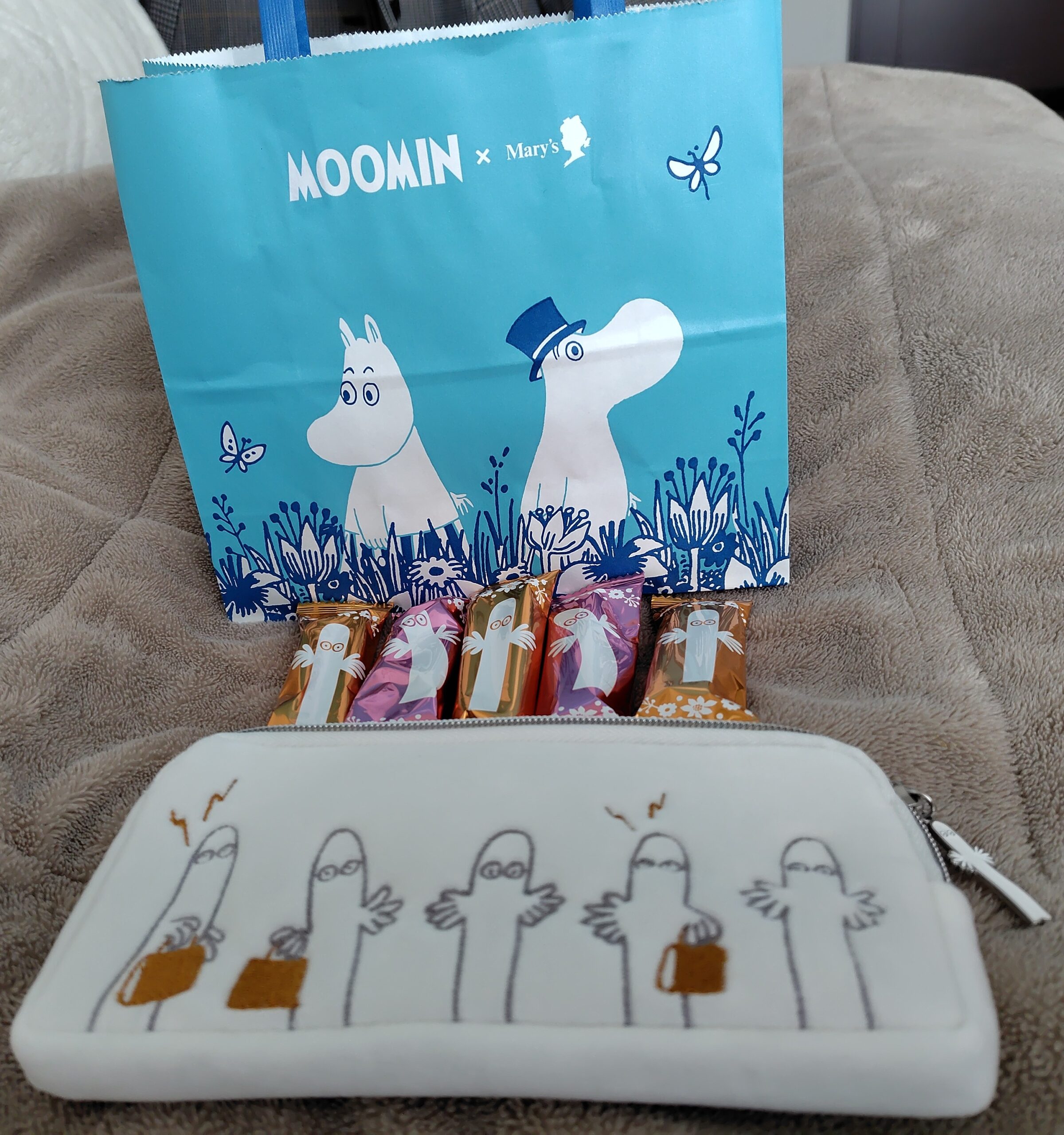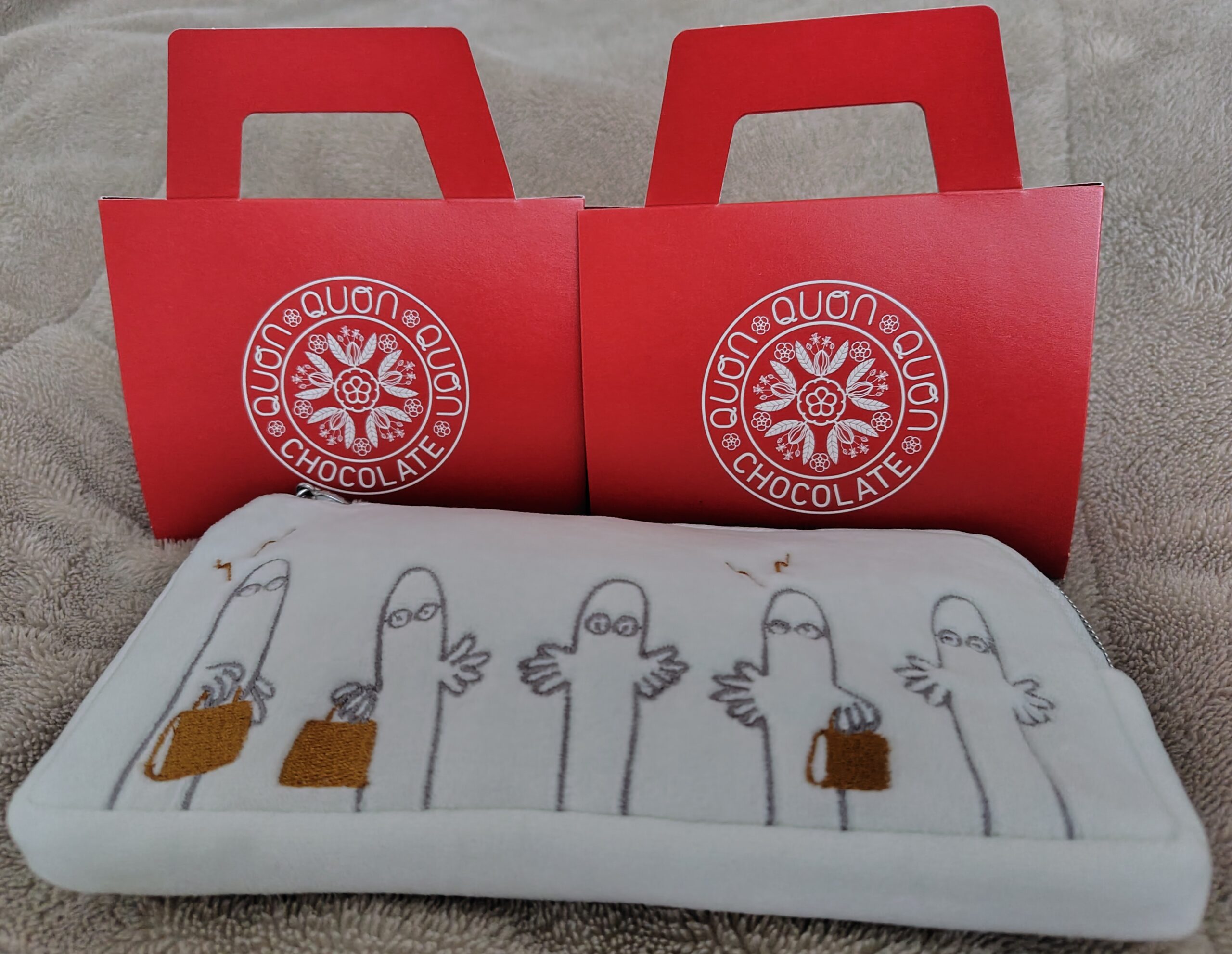 自分用には完全にパッケージ目当てでメリーチョコレートのムーミンコラボにしました!ふわふわの白いポーチにはニョロニョロの刺繍があり、後ろにはスナフキンのシルエット刺繍やチャックの持ち手がニョロニョロだったりと細かなところまで可愛い仕上がりです。チョコはウエハースに挟まれて軽い仕上がりなのでサクッと食べちゃいました。